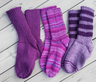 Og når det nærmer seg høst og vinter, må det jo strikkes litt ullsokker. Disse er til en ung dame som liker lilla :)